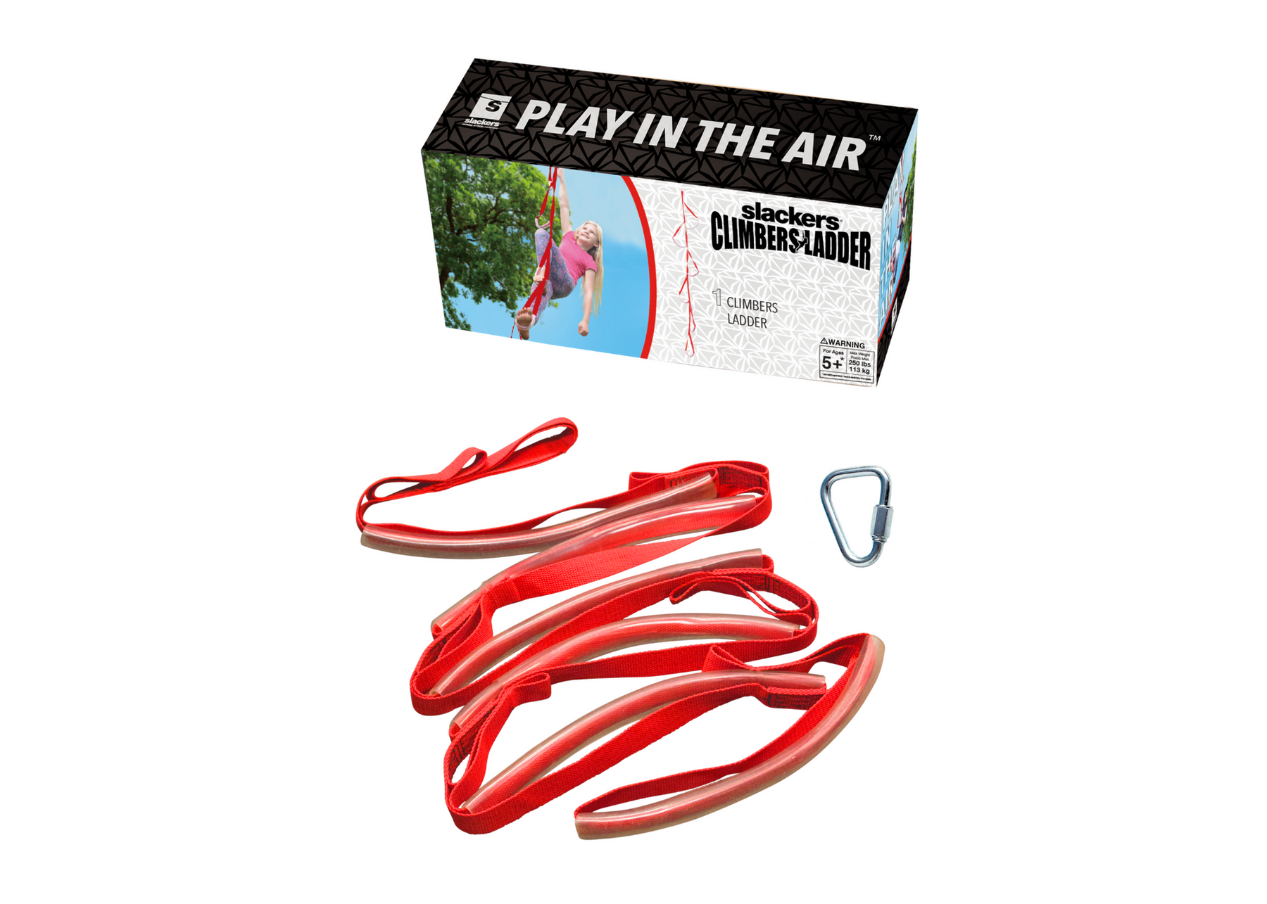 Inspired by professional rock climbers, our new Climbers ladder allows you easy access to our Ninjaline or just the chance to play in the air. Attach to our Ninjaline or a sturdy tree or play structure. Our product testers couldn't get enough of this ladder. Swing through the air with the greatest of ease or use it to climb to new challenges with the rest of our Ninja system, the climbers ladder folds up small for storage and is perfect for ages 5 and up. Includes delta carabiner for easy attachment to the Ninjaline or use our tree hangers (sold separately) to easily hang from a tree branch.